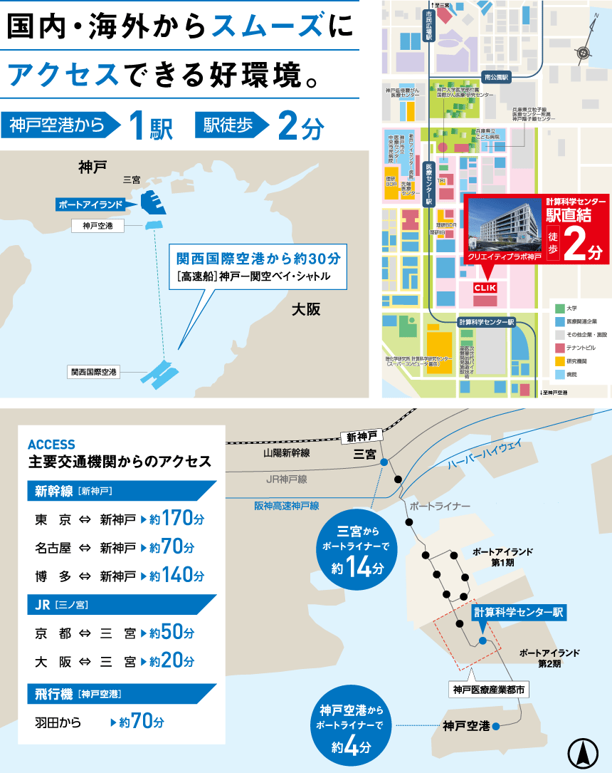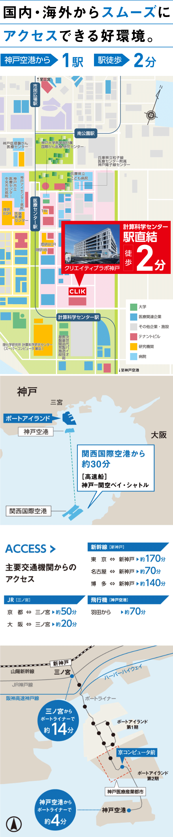 スタートアップ・クリエイティブラボ(SCL)は、ライフサイエンス分野に特化した研究開発型スタートアップのためのシェアラボです。「研究に没頭できる場の提供」、「資⾦調達・⼈材確保等」の両輪で、シード・アーリーのスタートアップの事業推進を支援する体制を整えています。また、神戸市が主導し、⽇本最⼤級のバイオメディカルクラスターに成長した神戸医療産業都市の地の利を活かし、医療系企業や研究施設と連携したエコシステムの醸成を実現します。